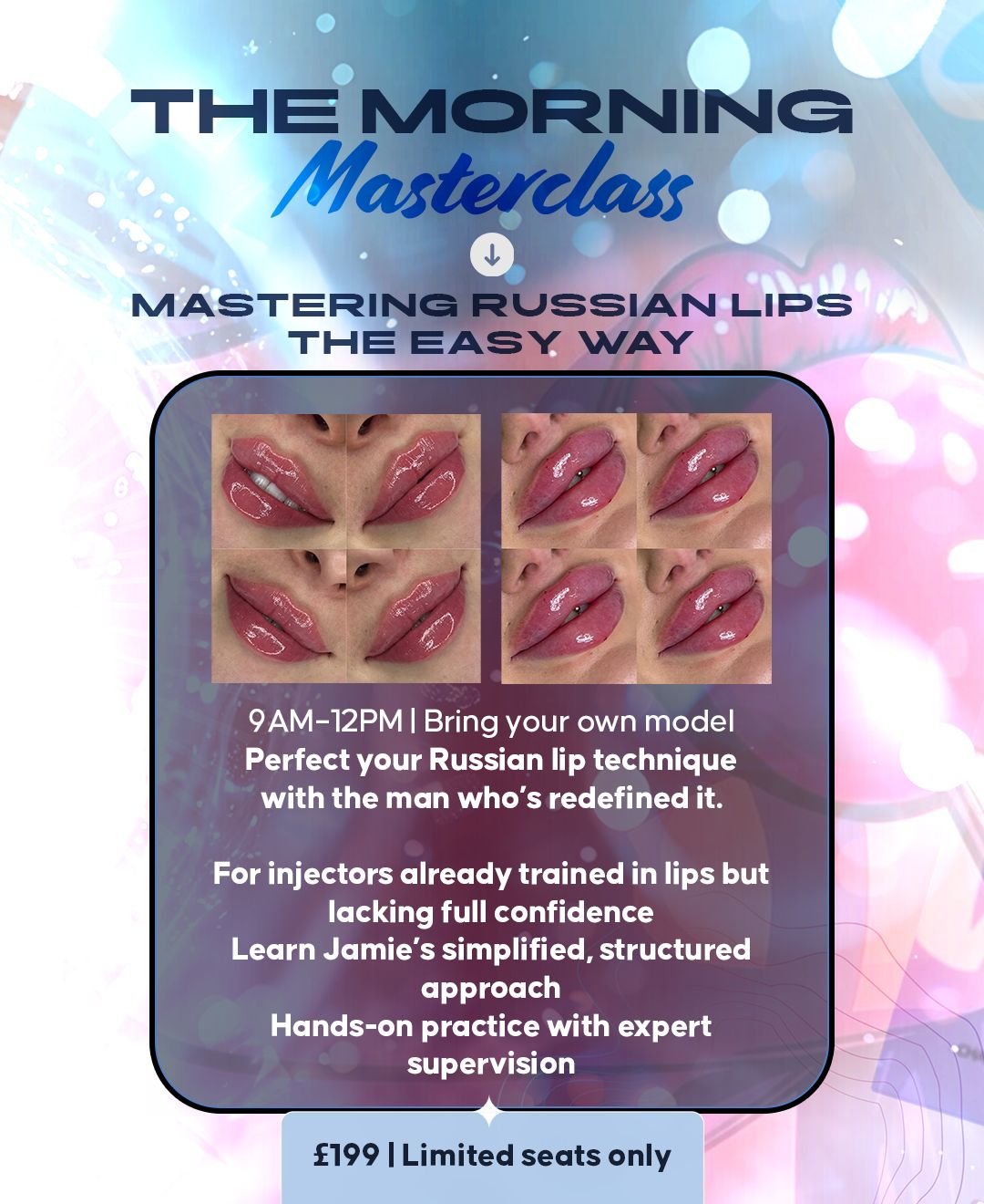 This hands-on morning masterclass is ideal for injectors who are already trained in lips but want to perfect shape, projection, and balance with expert supervision.